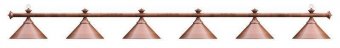 Изящная лампа классического дизайна органично впишется в любой интерьер. Устойчивые к механическим повреждениям металлические плафоны на металлической штанге обеспечивают не только качественное освещение игрового поля, но и создадут уютную атмосферу в бильярдном клубе или кабинете. Комплектуется цепочками и чашками для крепления к потолку. Предназначена для равномерного освещения игрового поля 10 - 12 футовых столов.