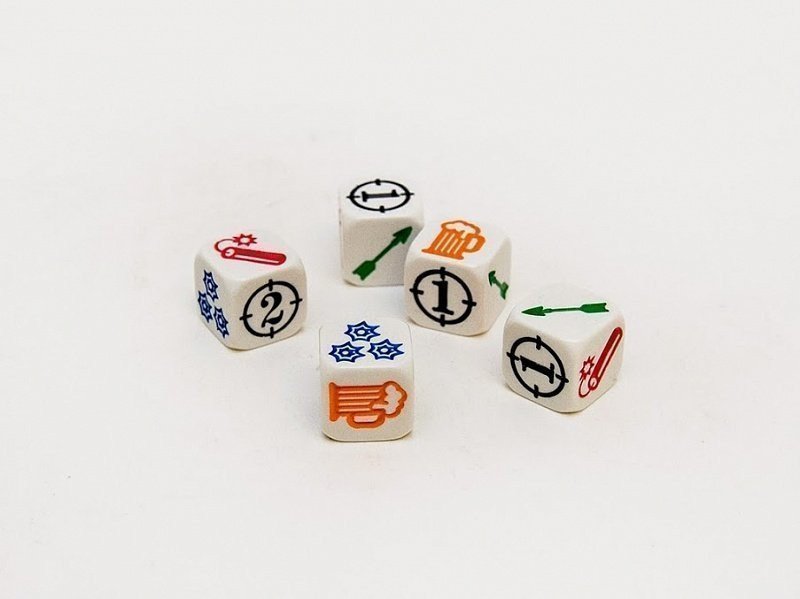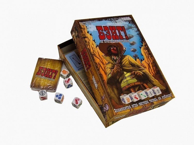 А в механике игры произошли изменения?Да, теперь во время своего хода каждый игрок бросает пять кубиков. Если вас не устраивает результат броска, вам дается две попытки на перебросы. Грани кубиков определяют судьбу персонажа, например, три динамита забирают одну жизнь и один ход, а три револьвера дают возможность поснимать здоровье у всех оппонентов и испугать краснокожих.