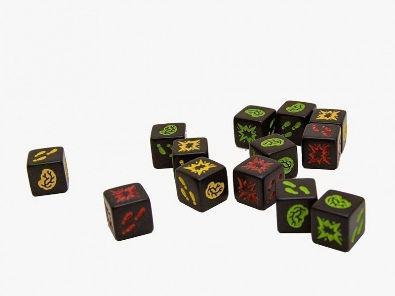 Начинаем трапезничать?Во время своего хода зомби-игрок кладет все 13 кубиков-жертв в коробку и тщательно трясет ее. Потом достает три кубика не глядя. Это могут быть три типа носителей мозгов, отличающихся по цвету: слабые – зеленые, средние – желтые, опасные – красные. Затем эти кубики бросаются и оценивается результат: