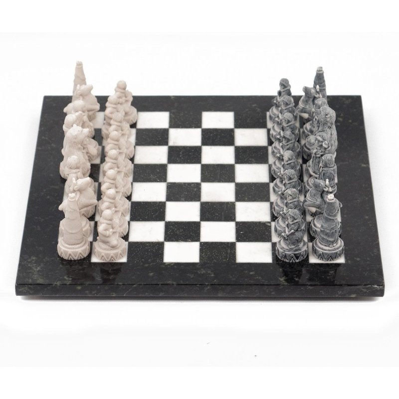 Шахматы 'Северные народы' нельзя назвать обычной игрой. Изысканное оформление, натуральные камни и ручная работа мастера указывают на высокий статус этого изделия. Такие шахматы могут быть оригинальным подарком для человека, который вам особенно дорог. Элегантность дизайна и утонченная красота делают их настоящим украшением интерьера.