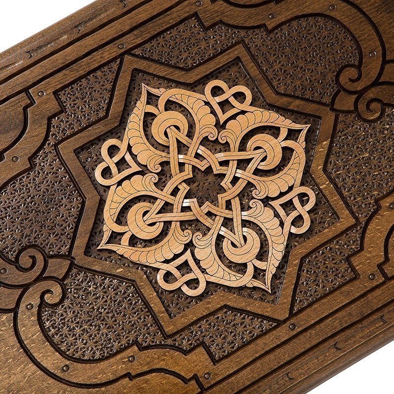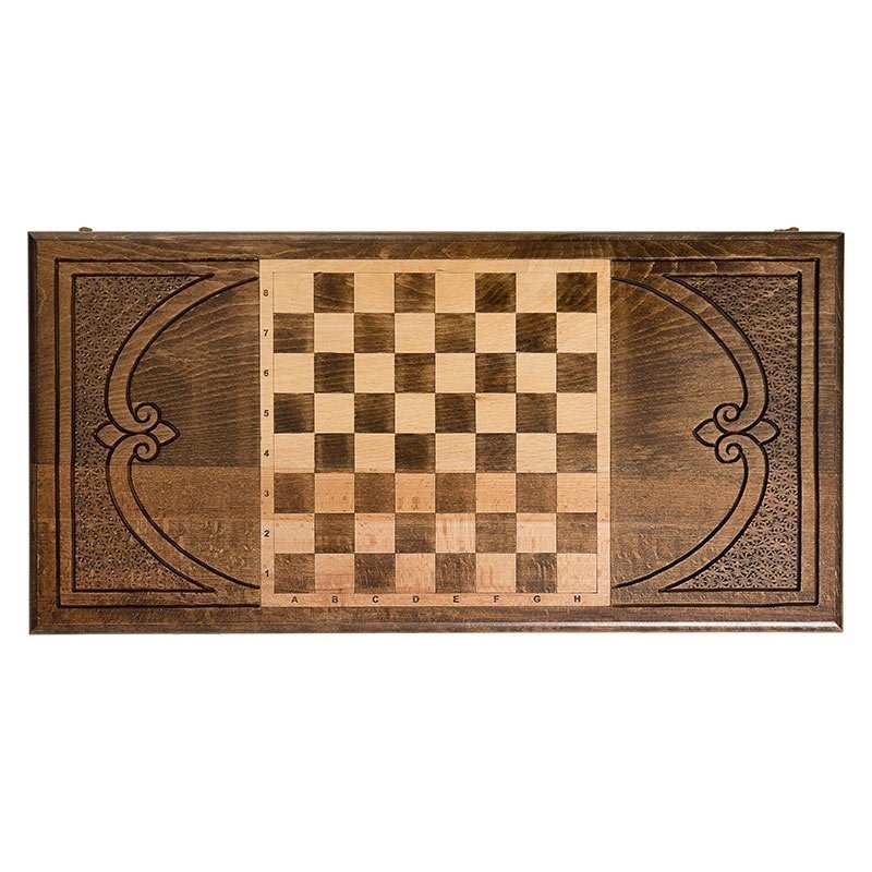 Обработано по высшему разрядуБлагодаря тому, что бук достаточно легко поддается обработке, мастеру удается выполнить изысканное украшение. На лицевой поверхности, помимо мелкого рифления вырезана 8 конечная звезда. Внутри нее выполнен изысканный узор, покрытый золотой краской. На второй створке, с внешней стороны, находится поле для игры в шашки, размером 8х8 клеток. А на внутренней поверхности, опять встречает 8 конечная звезда с красивым узором внутри. Каждая отдельная ячейка подчеркивается рисунком в форме вытянутой капли.