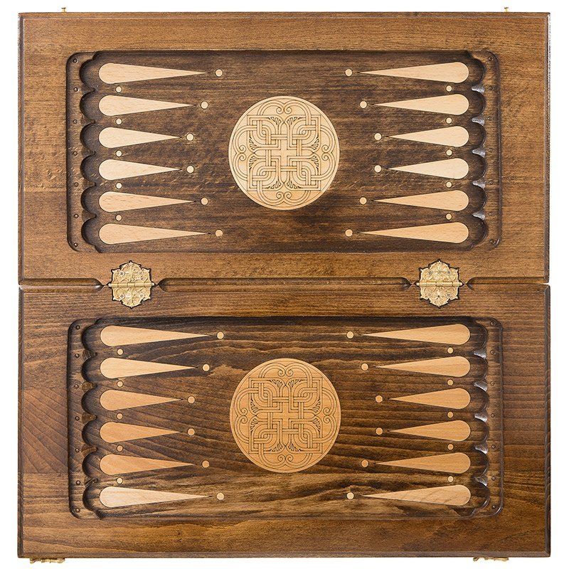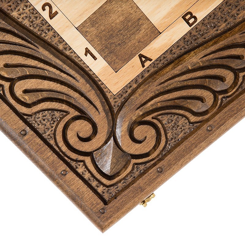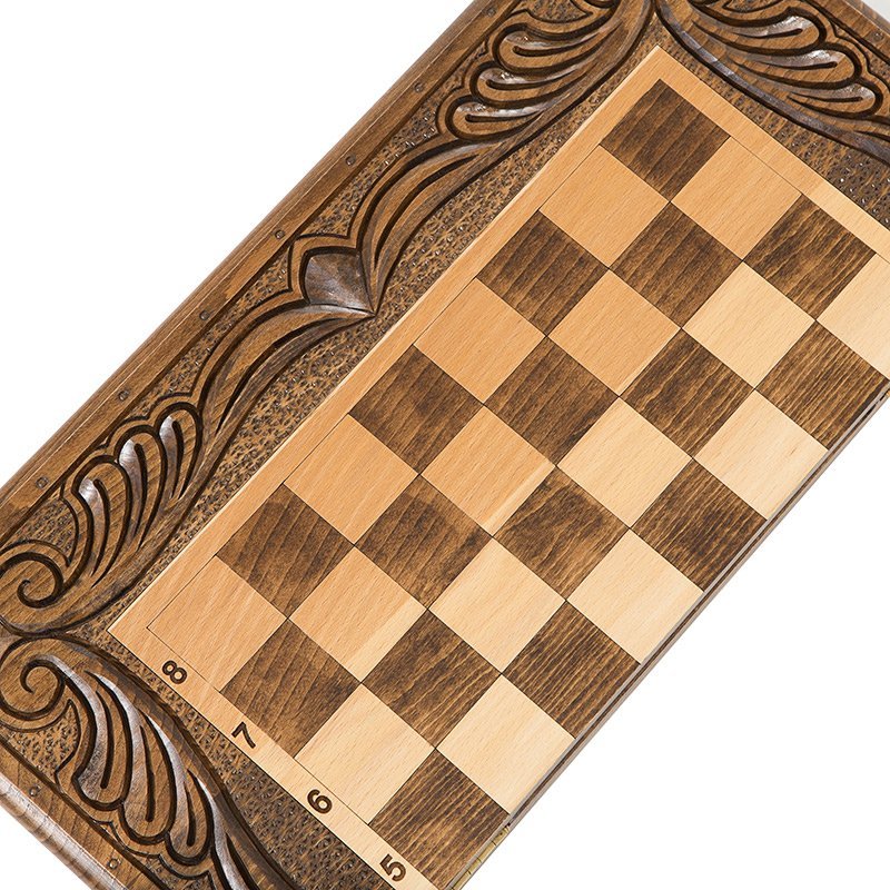 Для украшения, тут выполняется ручная резьба, причем с обеих сторон. На обратной стороне, где находится поле для нард, имеется геометрический рисунок в центральной части, а от каждой ячейки отходят светлые удлиненные капли. Лицевая поверхность служит для шахмат и шашек.