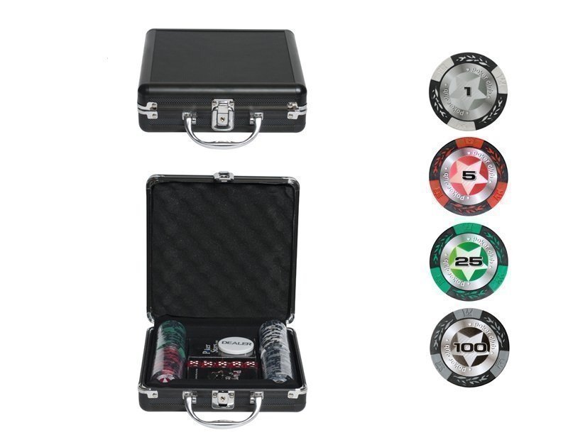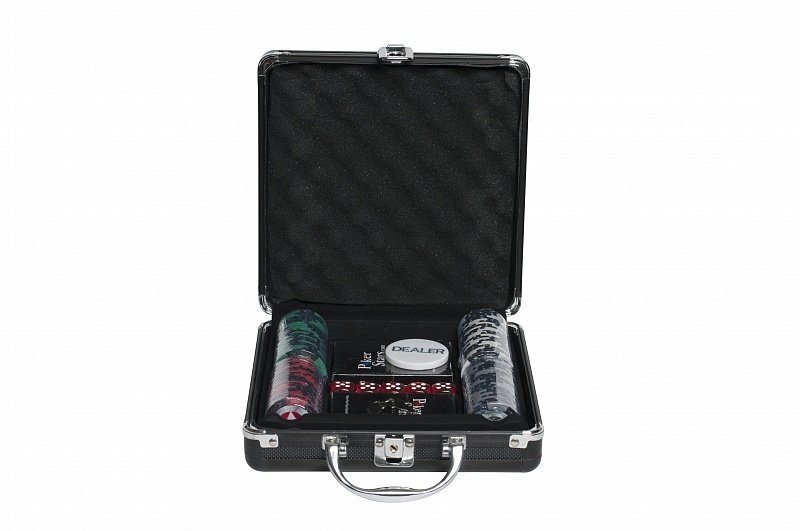 Долой скучное времяпрепровождение! Представляем Вашему вниманию набор для игры в покер Black Stars на 100 фишек, который разнообразит Ваш досуг и соберёт лучших друзей за круглым столом. В красивом стальном кейсе аккуратно сложено всё, что необходимо для достойно проведённой игры: фишка дилера, яркие фишки номиналами 1, 5, 25 и 100, 2 колоды 100% пластиковых карт, а также игральные кости. Данный покерный набор имеет отличный размер, что позволяет брать его с собой в гости или поездки.