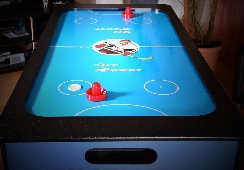 Стол отличается продуманной конструкцией и повышенной устойчивостью. С помощью удобного табло и специальной электронной системы происходит автоматический подсчет количества голов. Столешница такого аэрохоккея имеет специальное покрытие, что обеспечивает хорошее скольжение шайбы. Стол подключается к электросети и комплектуется всем необходимым для игры.