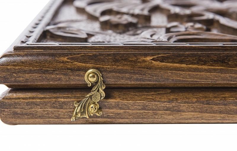 Резные нарды «Монастырь в горах» - одна из самых известных работ популярного армянского мастера. Она давно завоевала заслуженную популярность и по праву считается одной из лучших моделей подарочных нард. Доска сделана из массива орехового дерева. Резьба, осуществленная вручную, защищена лаковым покрытием. Фурнитура для скрепления изготовлена из меди – металла, не подверженного ржавению. Также защищена и каждая фишка – специальная подложка предотвращает вероятность царапания доски.