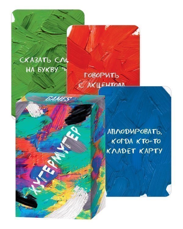 Вся прелесть игры в том, что нужно выполнять одновременно три задания из этих трех карт, поэтому приготовьтесь к реально крутым испытаниям: разговаривать с акцентом, забыть, что у вас есть правая рука, играть только стоя, выполнять задания с закрытым глазом и еще много издевательств, которые придумали создатели этого безобразия под названием Хугермугер.