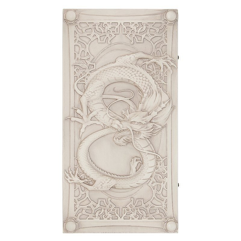 Картина из дереваЛицевая часть одной из створок украшена изображением китайского дракона. Примечательно, что выполнено это ручным способом, без использования современных механизмов и оборудования. Вокруг дракона вырезан крупный узор, напоминающий металлическую клетку. С обратной стороны все то же самое, только в зеркальном отображении. Изнутри, в центральной части, выполнен угловатый узор, а каждая отдельная ячейка подчеркивается мелкими элементами.