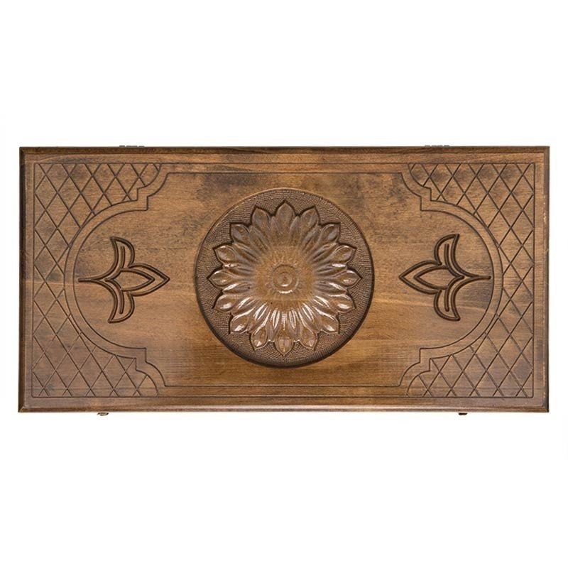 Настольный нарды "Цветок" - яркая модель популярной настольной игры. Доска и фишки покрыты лаком. На доске нанесен резной рисунок в виде цветка.