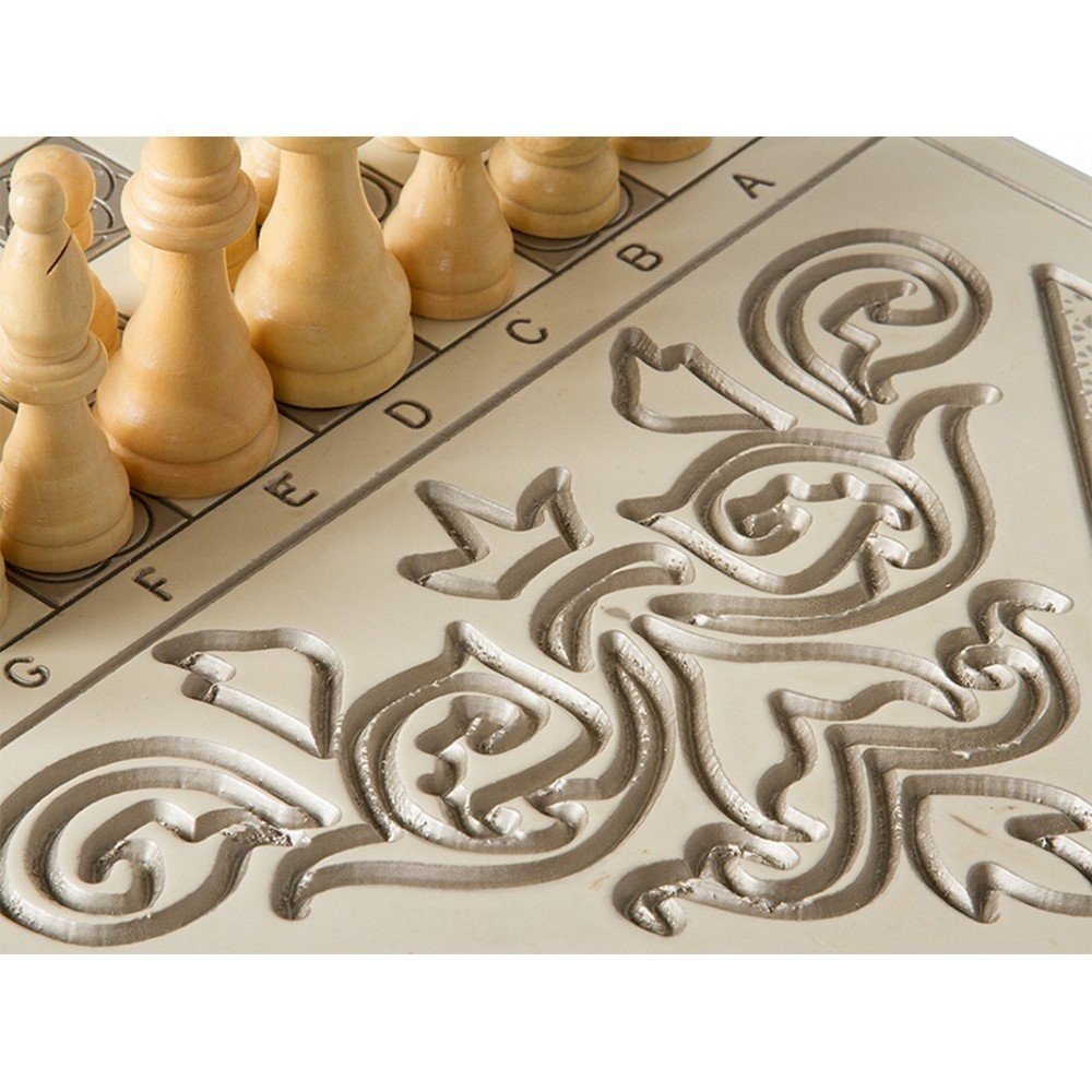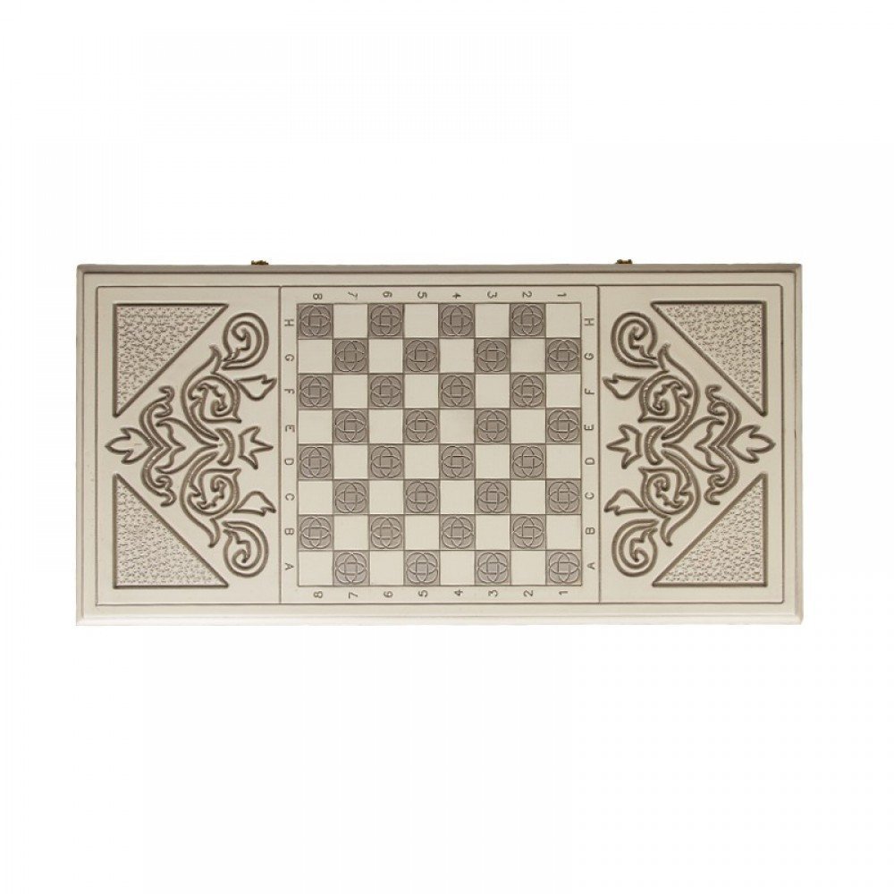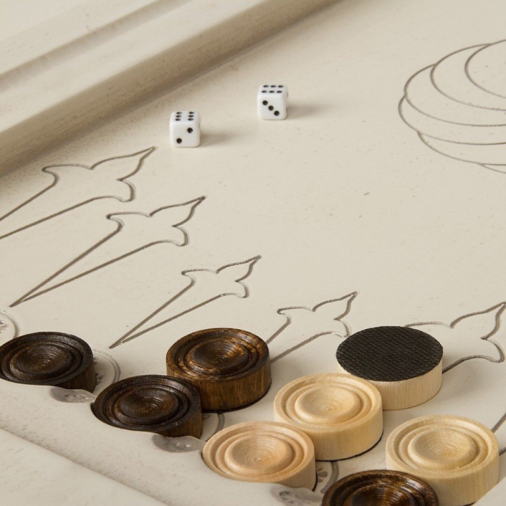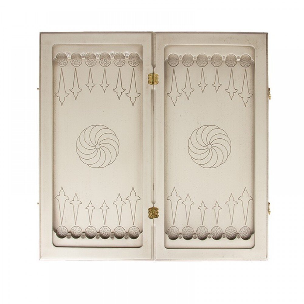 Украсит любой интерьерВерхняя сторона створки представляет собой шахматную доску, с характерными клетками контрастных цветов, а по бокам от нее вырезан узор. В открытом виде она превращается в поверхность для нард с украшенными ячейками. Весь стол покрыт искусственной патиной, что придает ему более старинный вид. Фигурки, фишки и камни уже добавлены в комплект, поэтому докупать больше ничего не нужно, а можно сразу же приступить к игре.