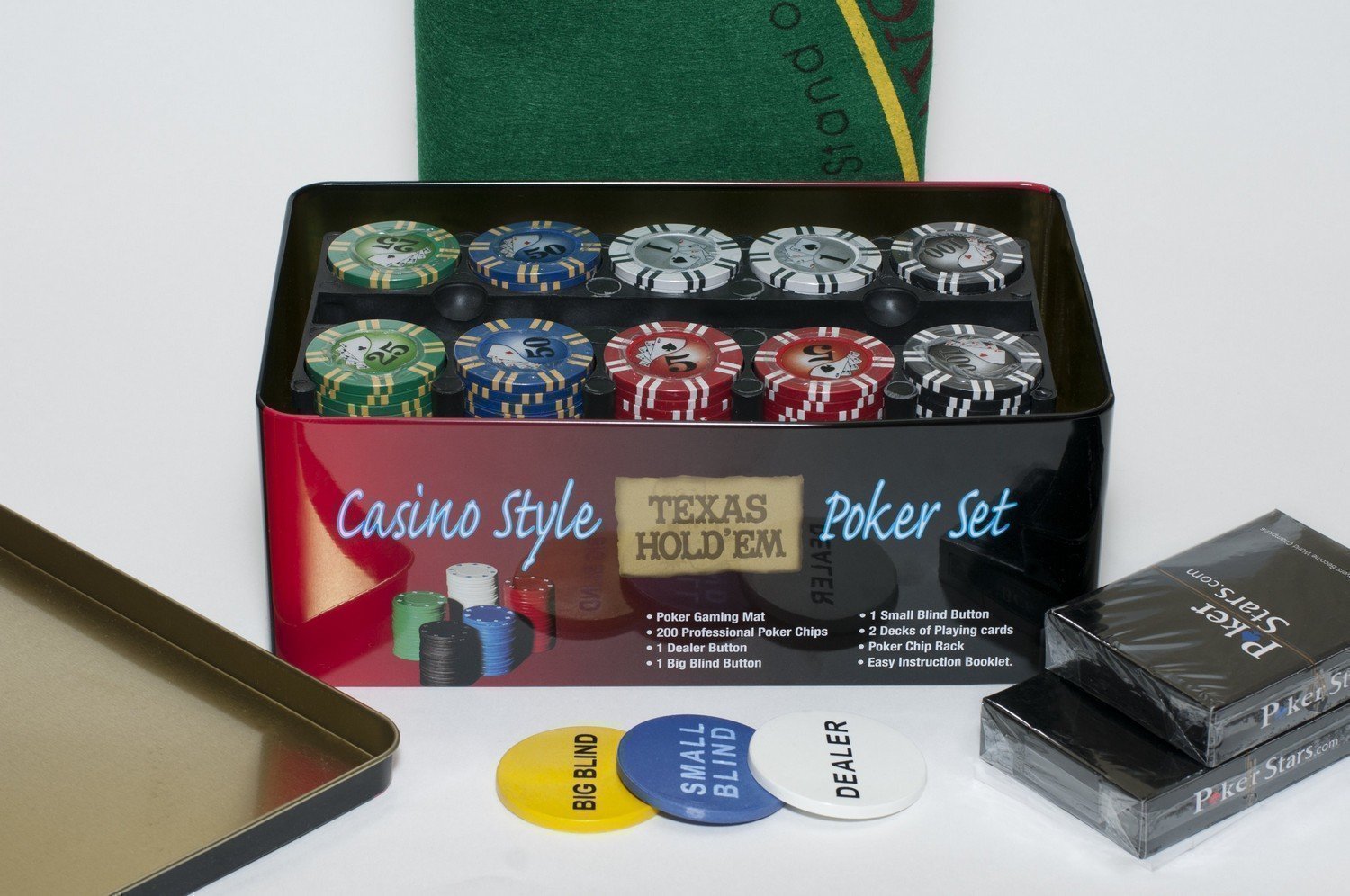 Первое, что бросается в глаза – удобная жестяная упаковка, с помощью которой набор можно брать с собой в путешествие. Главное – 200 фишек спокойно хватит для комфортной и очень продолжительной игры. На фишках заранее обозначен номинал, что значительно облегчает итоговый подсчет очков. Кроме самих фишек, вы получаете 2 колоды карт по 54 штуки в каждой, изготовленные из пластика, фишку дилера и сукно, с помощью которого сможете играть в покер даже во время отдыха на природе.