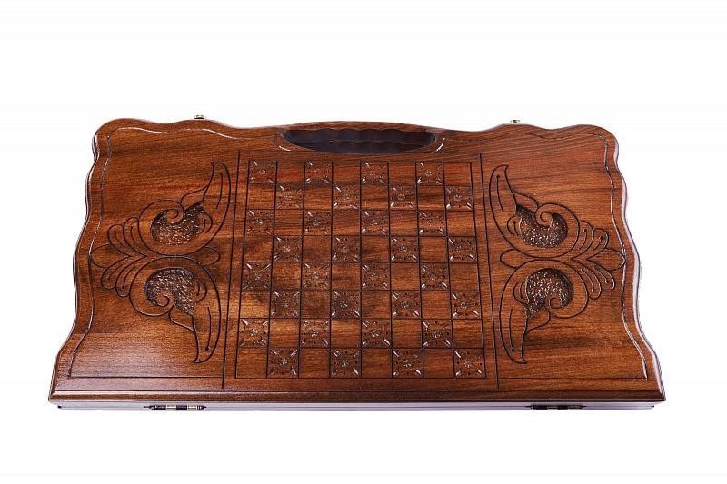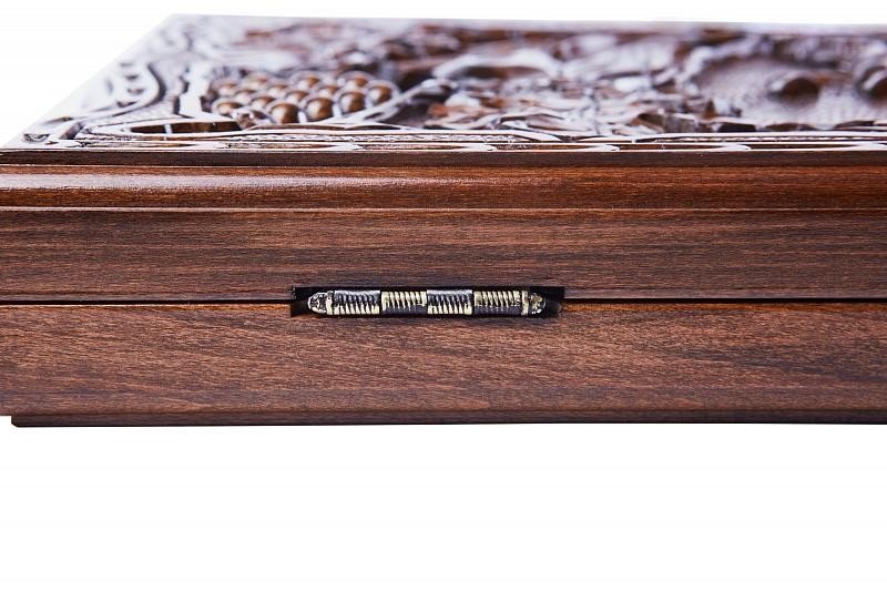 Резные нарды «Всадник» впечатлят своим внешним видом даже искушенных коллекционеров традиционных настольных игр. Каждая деталь в доске, сделанной из буковой древесины, настолько проработана, что остается только восхищаться мастерством автора. Это безукоризненно выполненная ручная работа. Фурнитура сделана из бронзы, она износостойка и долговечна. Каждая деталь покрыта защитным лаком. Кроме того, на каждой фишке есть подложка, предотвращающая механическое повреждение доски во время игрового процесса. Также на оборотной внешней стороне есть поле для шашек.