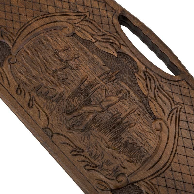 Можно брать с собойВес доски сравнительно небольшой и составляет 4 кг. Её можно брать с собой, отправляясь к друзьям или на прогулку в парк. Внутрь доски поместятся все фишки, створки закрываются на крючок, упаковывается в бархатный чехол, которой также есть в комплекте. Для переноса предусмотрена специальная ручка, являющаяся частью самой доски и выполненная в едином стиле. Играть интереснее, если сможете найти себе хорошего противника, поэтому не медлите и уже сейчас покупайте нарды резные Охота.