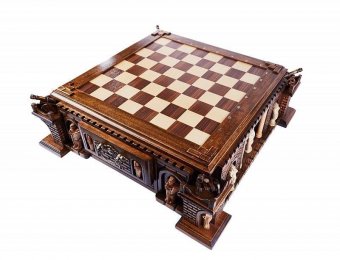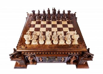 Почувствуйте себя на настоящем поле эпичной битвы, пребывая при этом в безопасности. Резные шахматы в ларце «Пушка» предоставляют такую возможность. Изготовленные вручную из буковой древесины талантливым мастером они – настоящее произведение искусства. Углы массивной высокой доски украшены вырезанными пушками. Резные фигуры, стилизованные под воинов, прячутся в выдвижные ящички, вмонтированные по бокам внизу доски. Сама же доска не складывается. Для обеспечения долговечности каждый элемент покрыт защитным лаком.