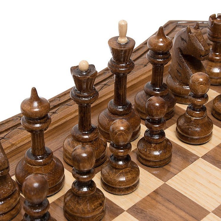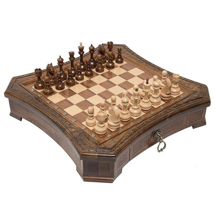Притягивает взглядСам ларец уже с первого момента привлекает взгляд своим оформлением – практически все поверхности украшены узорами, а древесная структура нарочито подчеркнута. Клетки поля для игры выполнены в контрастных цветах, аналогичных комплектным фигурам. На боковой панели предусмотрен ящик для хранения.
