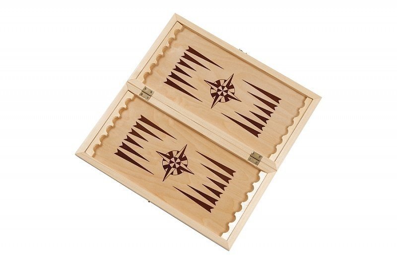 Представленные нарды украшены с внутренней стороны простым и незамысловатым рисунком – роза ветров. В этом можно увидеть некий скрытый смысл, ведь небольшой размер доски предполагает - что она может стать отличным спутником во время путешествия. В качестве материала изготовления, как доски, так и фишек, использовано настоящее дерево, благодаря чему срок службы практически ничем не ограничен.