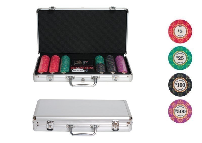 Представленный набор для покера произведен китайской компанией Partida. Он включает две колоды износостойких пластиковых карт по 54 единицы каждая, пять костей и дополнительную дилерскую фишку. В комплект входят триста фишек общим номиналом около 35 тысяч очков. В наборе представлены четыре номинала – 1, 5, 25, 100 и 500 очков. Высококачественная керамика, из которой изготовлены все составляющие этой игры, в сочетании со стойкой печатью позволит набору прослужить вам максимально долго. Все перечисленные предметы хранятся в прочном и легком металлическом кейсе элегантного серебристого цвета. Представленный набор предназначен в первую очередь для любительских партий, но подойдет и профессионалам.