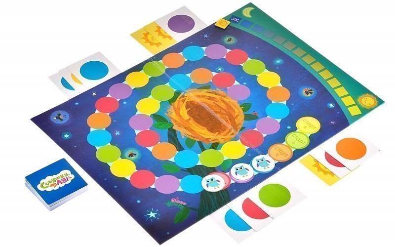 А разве совы не летают?Совы летают, но могут это делать лишь на небольшие расстояния между кружочками на игровом поле. В начале партии участники выставляют совушек на старте, причем здесь нет своих или чужих фишек – все они общие и каждый сможет двигать любую. Из общей колоды вытаскивается 1 карточка, которая отображает цвет: