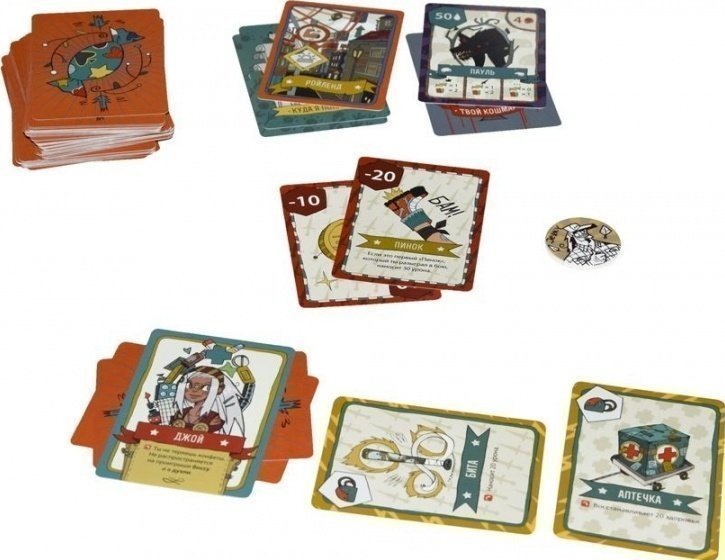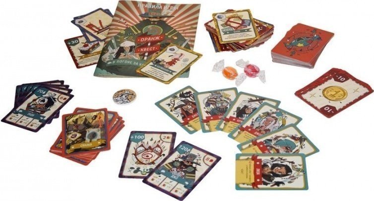 Краткое описание игры Настольная игра «Оранж Квест: в погоне за Конфетным Джо» повествует нам о смелых путешественниках, пустившихся в погоню за известным преступником, укравшим огромное количество конфет. Путешественников ждут интересные задания, увлекательные и опасные приключения. Но есть и приятное: их ждет масса сладостей. Игроки с помощью монетки выбирают первого героя, кто делает ход. Также именно монетка решает, какие задания выпадут на долю героев. Как играть? В начале игры все карты выкладываются на стол рубашкой вверх. Карточки действий и предметов раздаются игрокам по пять карт в руки. Также все участники игры получают по карточке с героями. Каждый персонаж на карте имеет уникальные способности, и у всех они разные. Настольная игра состоит из нескольких раундов. Есть даже распорядок дня. Например: