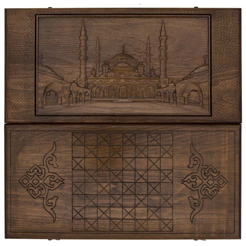 На поверхности одной из створок вырезана мечеть из города Грозного, поэтому и было дано такое название. Все сделано на очень хорошем уровне – каждая деталь подчеркнута и заметна. Вторая створка снабжена полем для игры в шашки, чтобы можно было отвлечься и расслабиться между партиями. Створки скрепляются между собой петлями из бронзы, отличающимися мягкостью и долговечностью. Из этого же сделаны и крючки. Внутренние поверхности украшены небольшим узорчатым рисунком по центру, а каждая ячейка дополнительно покрыта орнаментом.