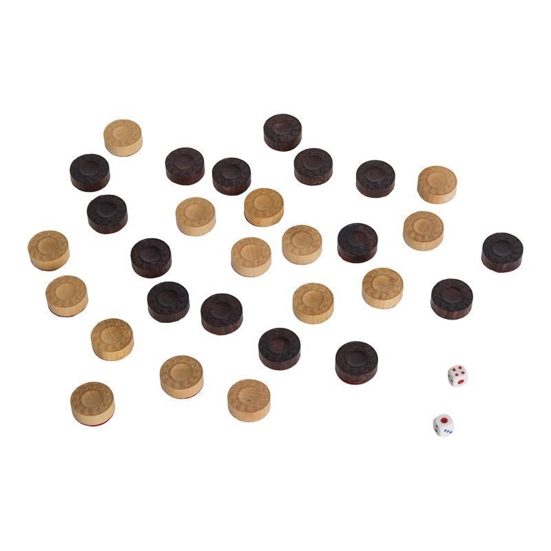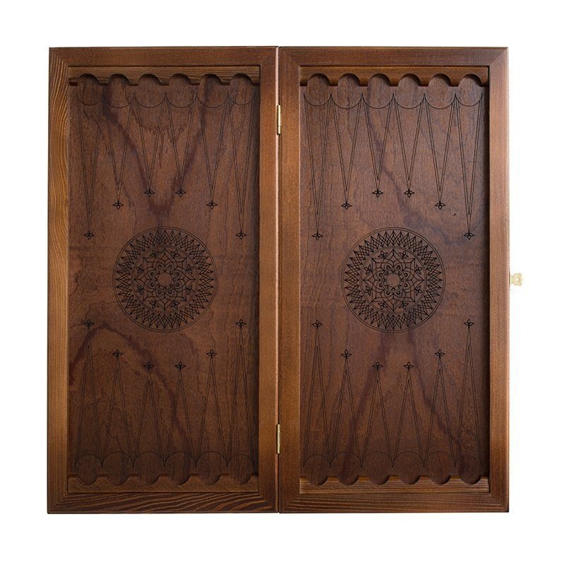 Игровое поле выполнено по всем канонам восточного декора: его украшает резной геометрический узор, сквозь который просматривается фактура дерева. Резьба на поверхности фишек продолжают восточные мотивы игрового поля, создавая законченную композицию.