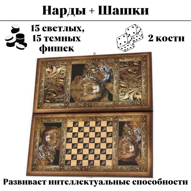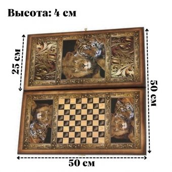 Представляют собой двойной комплект, позволяющий также играть в шашки. Для этого на одной из створок короба снаружи нанесена разметка квадратного поля для этой игры. Это поле заключено в орнаментальную рамку и окружено изображениями льва и тигра – в таких же рамках. Увеличенная копия этих изображений помещена на другую створку короба. Принты нанесены на древесину методом шелкографии и выдержаны в древесно-песочной гамме.