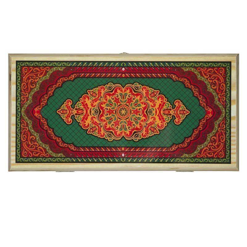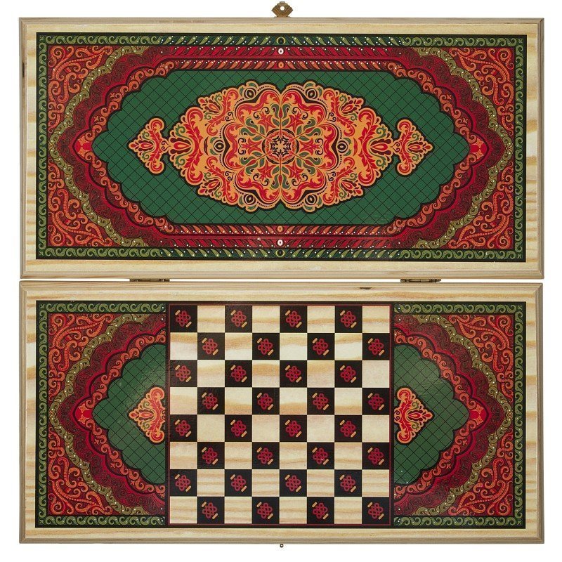 Полноразмерный набор 2-в-1 шашки и нарды 'Зеленый узор' – отличный вариант подарка, который, несомненно, порадует любого поклонника классических настольных игр. Также он может стать прекрасным пополнением домашней коллекции настольных игр. Комплект, состоящий из всего необходимого для игры в шашки и нарды, изготовлен из качественной натуральной древесины и украшен традиционным орнаментом, который нанесен в технике шелкографии. На доске, скрепленной алюминиевыми петлями, также нанесены поля для шашек и нард. Кроме того, в набор входит полный комплект фишек для этих классических игр.