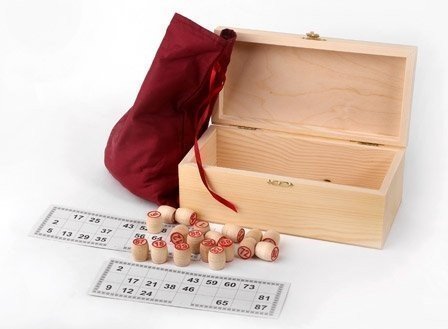 В деревянном сундучке есть все, что необходимо для веселого времяпрепровождения: бочонки, карточки, фишки и мешочек для перемешивания бочонков. Играть можно